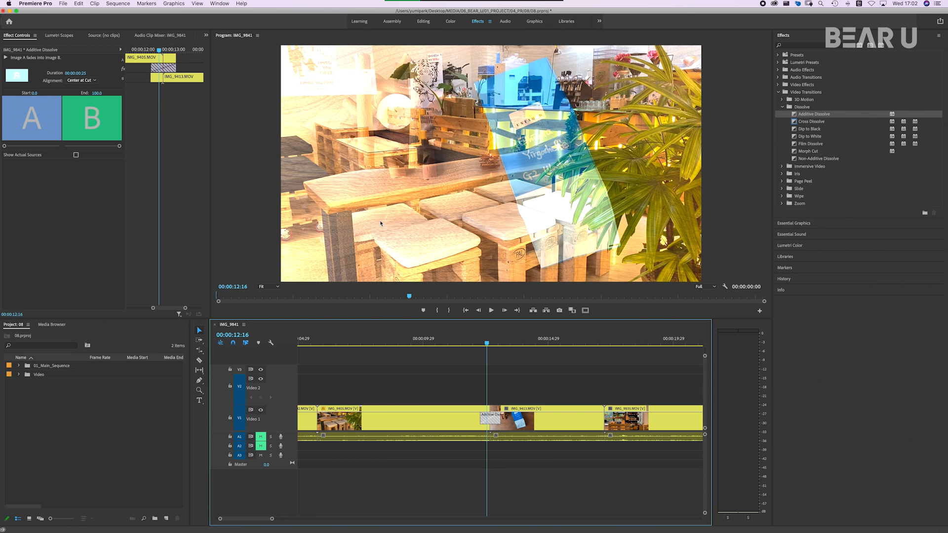 Work space 패널의 Effects 에서 Video Transition 의 Dissolve 의 원하는 트랜지션(변환 효과)을 드래그해서 Track의 영상들 사이에 삽입.